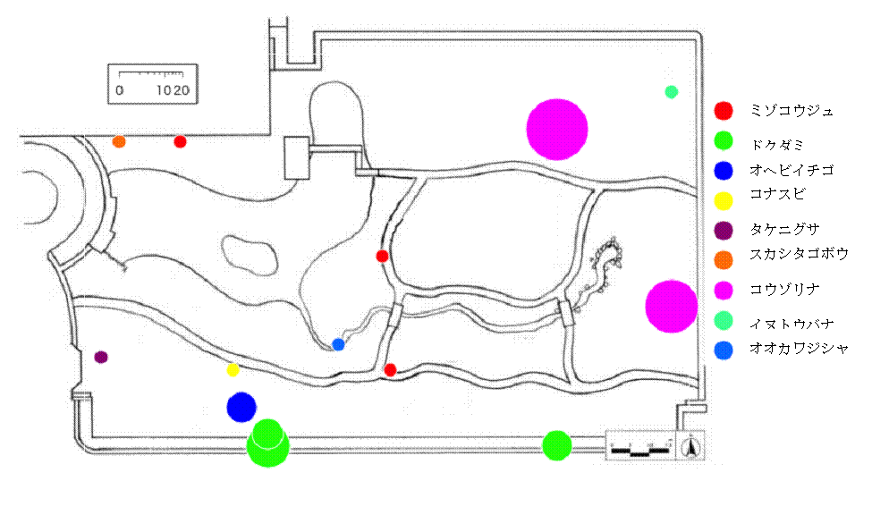 図10 アドバンテストビオトープにおいて、5月に確認された植物の分布地点と分布面積。調査日は2007年5月18日