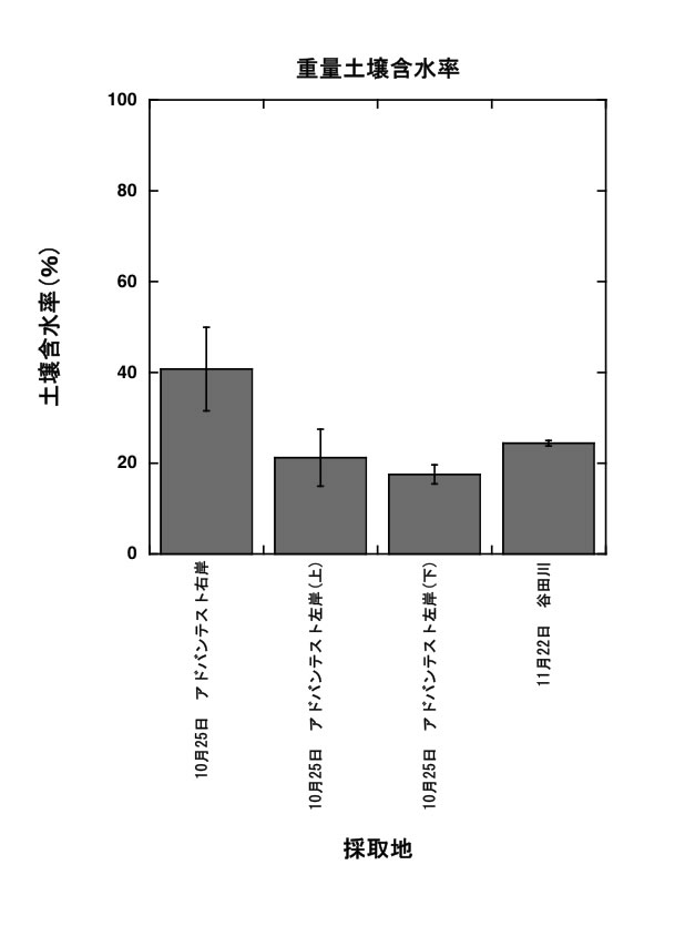 アドバンテスト・ビオトープ内せせらぎ下流(図2)のフジバカマを移植した3地点において2012年10月25日に、その起源と考えられる谷田川において2012年11月22日に土壌を採取した。各土壌サンプルから石や利他−を除いた土壌を計量し、送風定温乾燥機内にて乾燥させた後、乾燥重量を測定し、湿潤重量と乾燥重量から土壌含水率を計算により求めた。n=3。